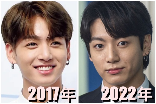 続いて左が2017年(20歳)頃、右が2022年(25歳)頃のジョングクさんです。