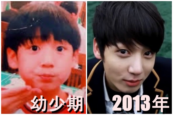 左が幼少期、右が2013年(15歳)頃にBTSとしてデビューしたジョングクさんです。