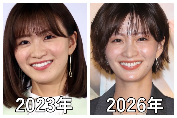 続いて、左が2023年(28歳)頃、右が2026年(現在)の岡崎紗絵さんです。