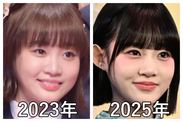 比較すると、2025年(現在)の方がメイクが濃くなりアイラインが太くなったことで目が大きく見えます。