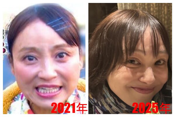 左が2021年のAマッソのがんばれ奥様ッソ!に出演した48歳頃で、右が2025年の52歳頃の金田朋子さんです。